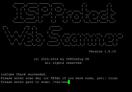 The scanner automatically checks for updates, then asks for the key (enter the word "trial" here) and then asks for the path of the websites, normally thats /var/www.